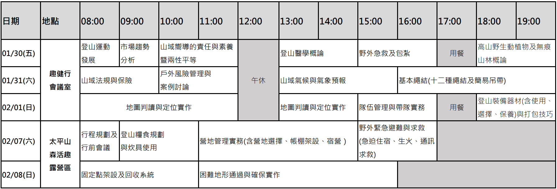 費用不包括個人裝備、課程期間餐食費用、私人花費、個人傷病醫療及交通費與未列於包括項目中之其他費用。