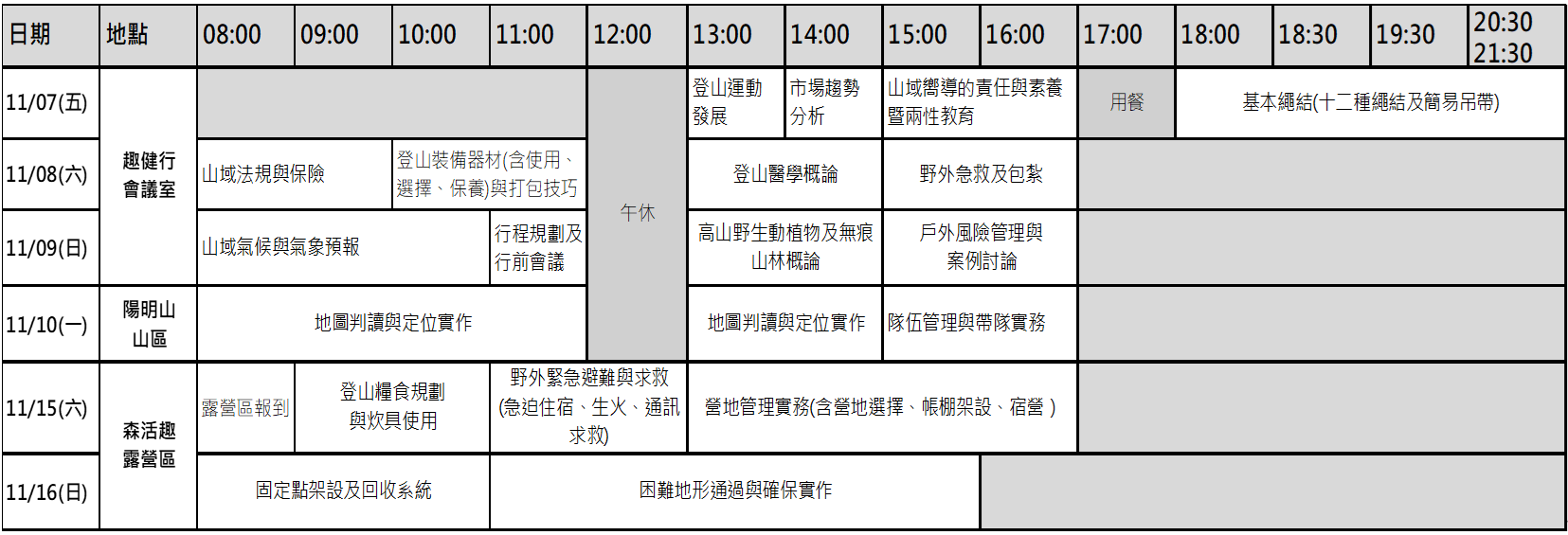以上費用包括講師費、講師交通住宿補貼、場地使用費、講義材料費、團體裝備費、保險費(含公共意外責任險)。