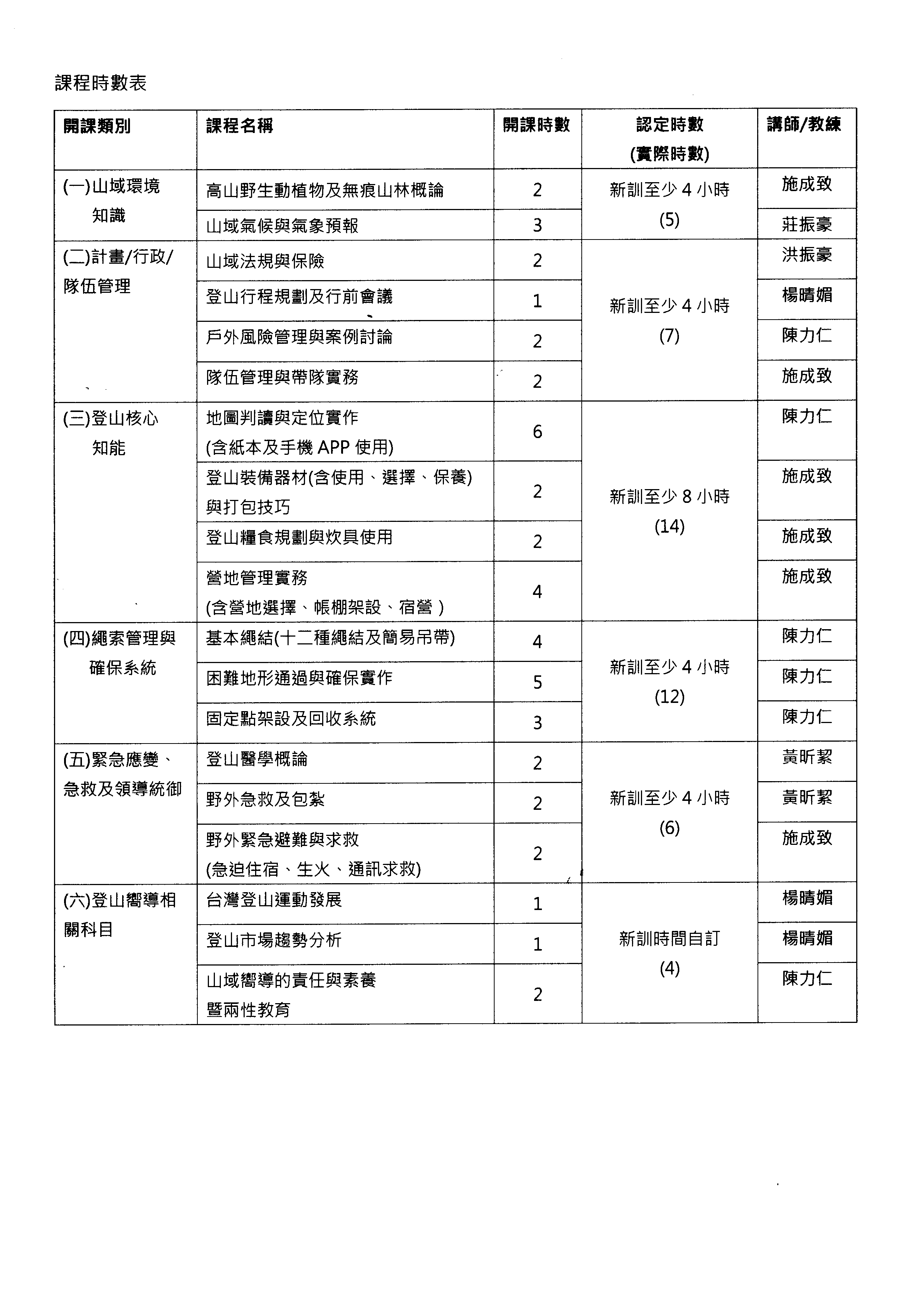 登山嚮導訓練分為室內課程與室外課程共6天,每梯次參與人數為6~10人,相關參加資格與流程如下。