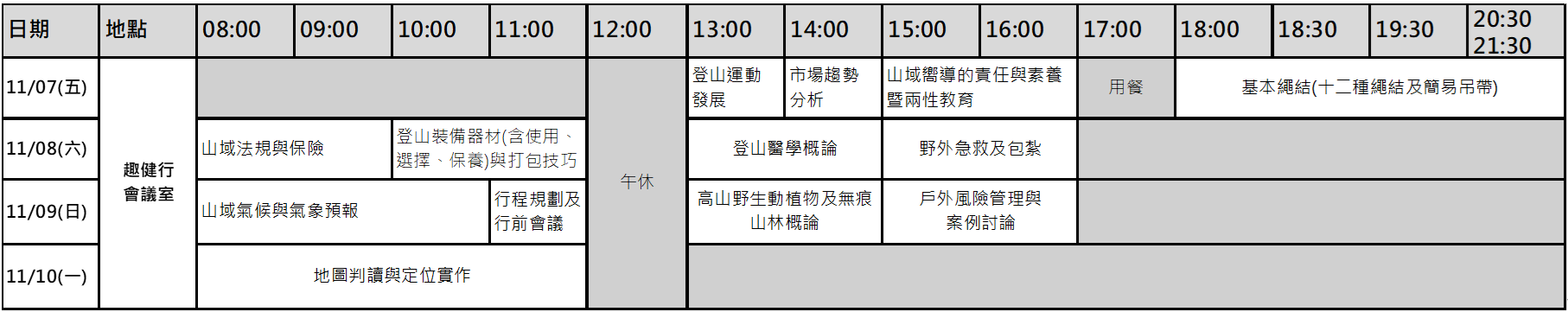 費用不包括個人裝備、課程期間餐食費用、私人花費、個人傷病醫療及交通費與未列於包括項目中之其他費用。