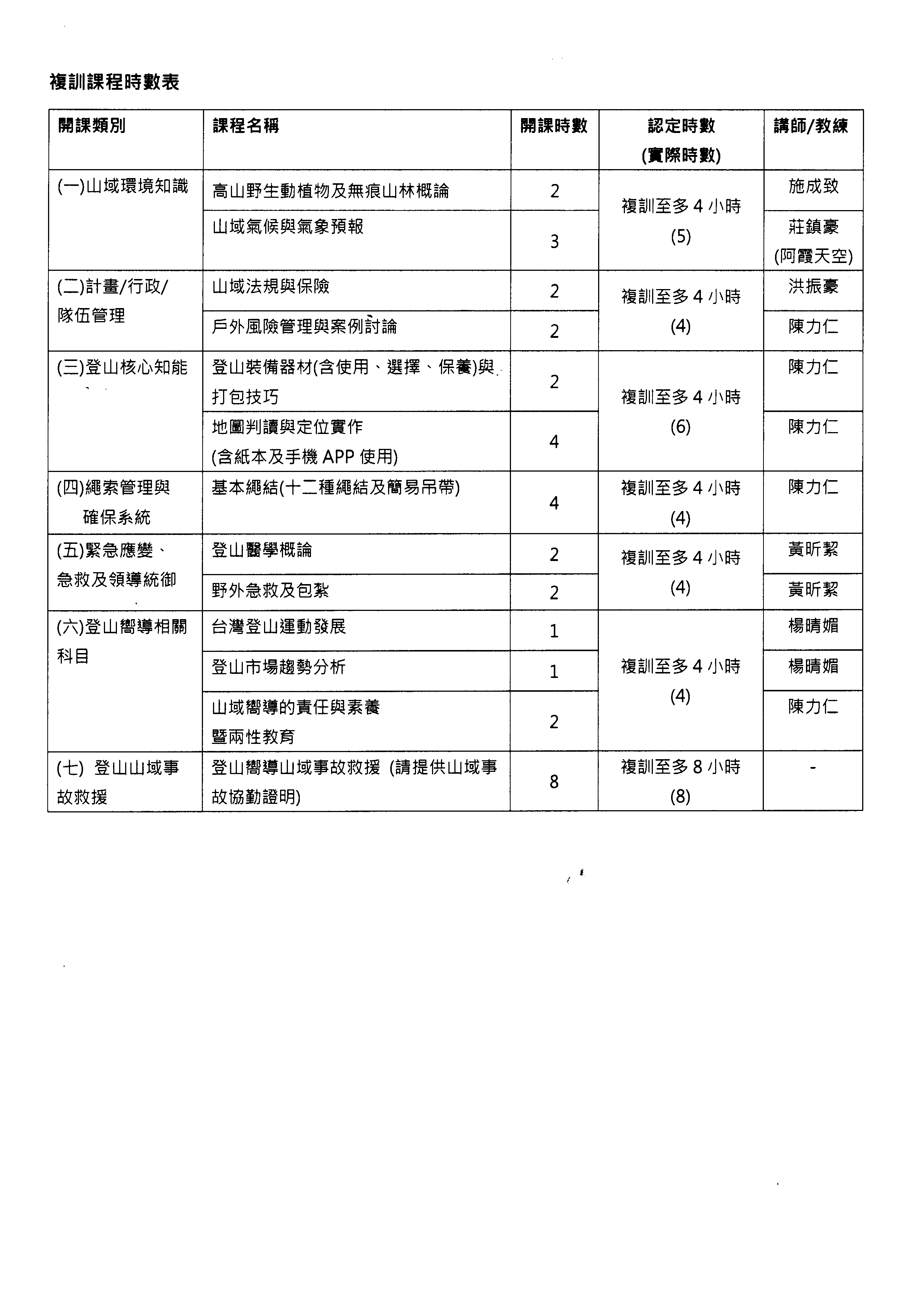 複訓者須完成累計二十四小時課程方得申請展延「山域嚮導證書」,效期四年。選課超過上列(七項)大科目的上限部分,時數不計入複訓時數。第七項<山域事故救援>時數,可於在證書效期內實際出勤支援山域事故搜救後,請消防單位核發證明文件,或向民間山域搜救志工組織等相關協勤單位取得證明文件,證明文件範本請向本機構索取。嚮導可持該證明文件由本機構認定後核發時數,最多8小時。